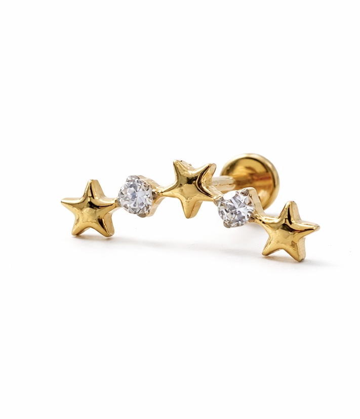 O design em formato de estrela com ponto de luz proporciona luminosidade e elegância ao visual, sendo perfeito para composições modernas e delicadas. Leve e hipoalergênico, oferece conforto para o uso diário, indicado para perfurações como helix, conch, flat e lóbulo.